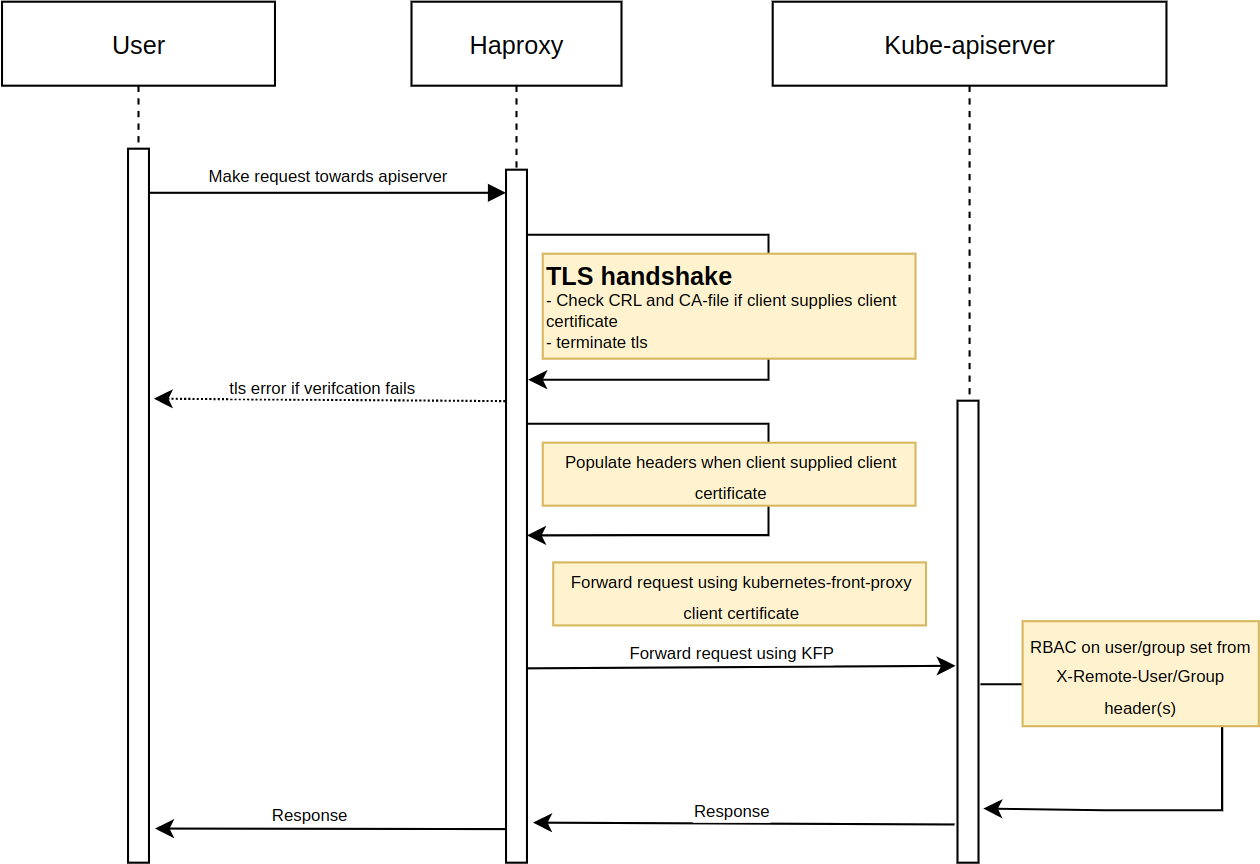 Using a TLS proxy creates one problem: Haproxy does not have the original client’s key. So it cannot connect to the kube-apiserver using their credentials. This means that the kube-apiserver will not recognise the user – “Hey it’s John!” – but will recognise Haproxy – “You again? You seem to be the only one that talks to me.”